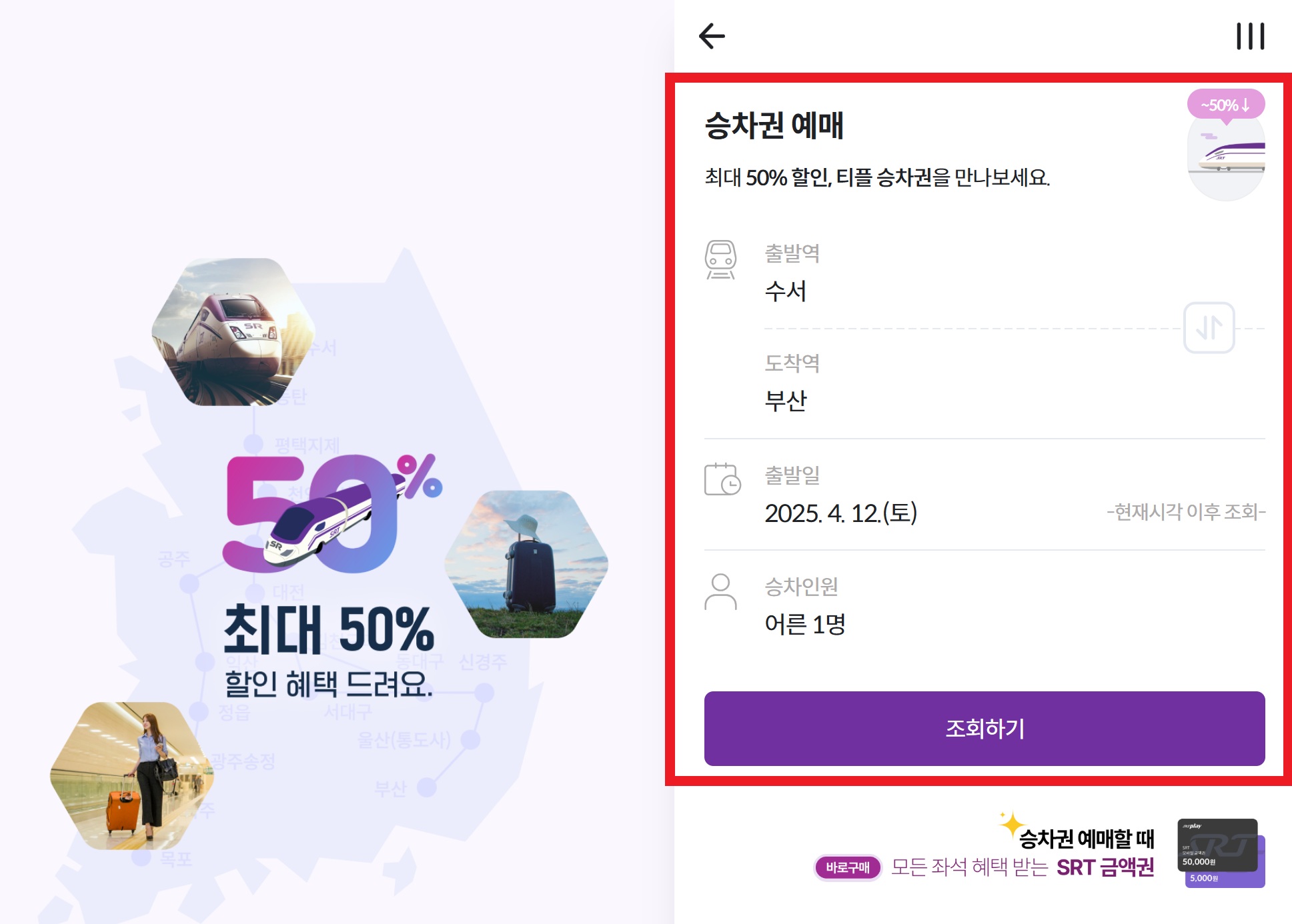 - 출발역 및 도착역 선택:수서, 동탄, 평택지제 등 출발역과 도착역을 선택합니다