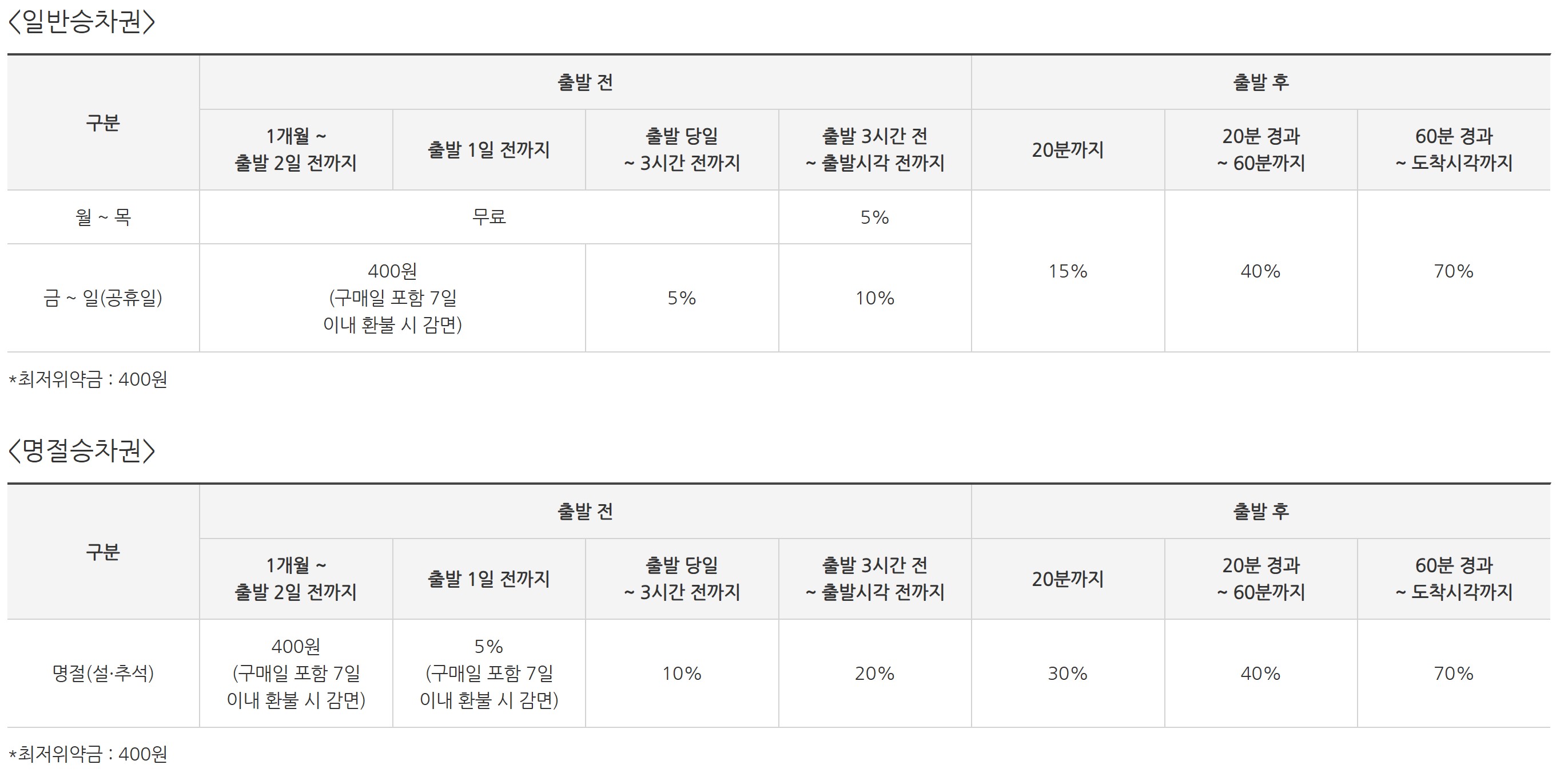 - 구입한 승차권을 환불하는 경우 환불시점에 따른 위약금이 발생합니다.