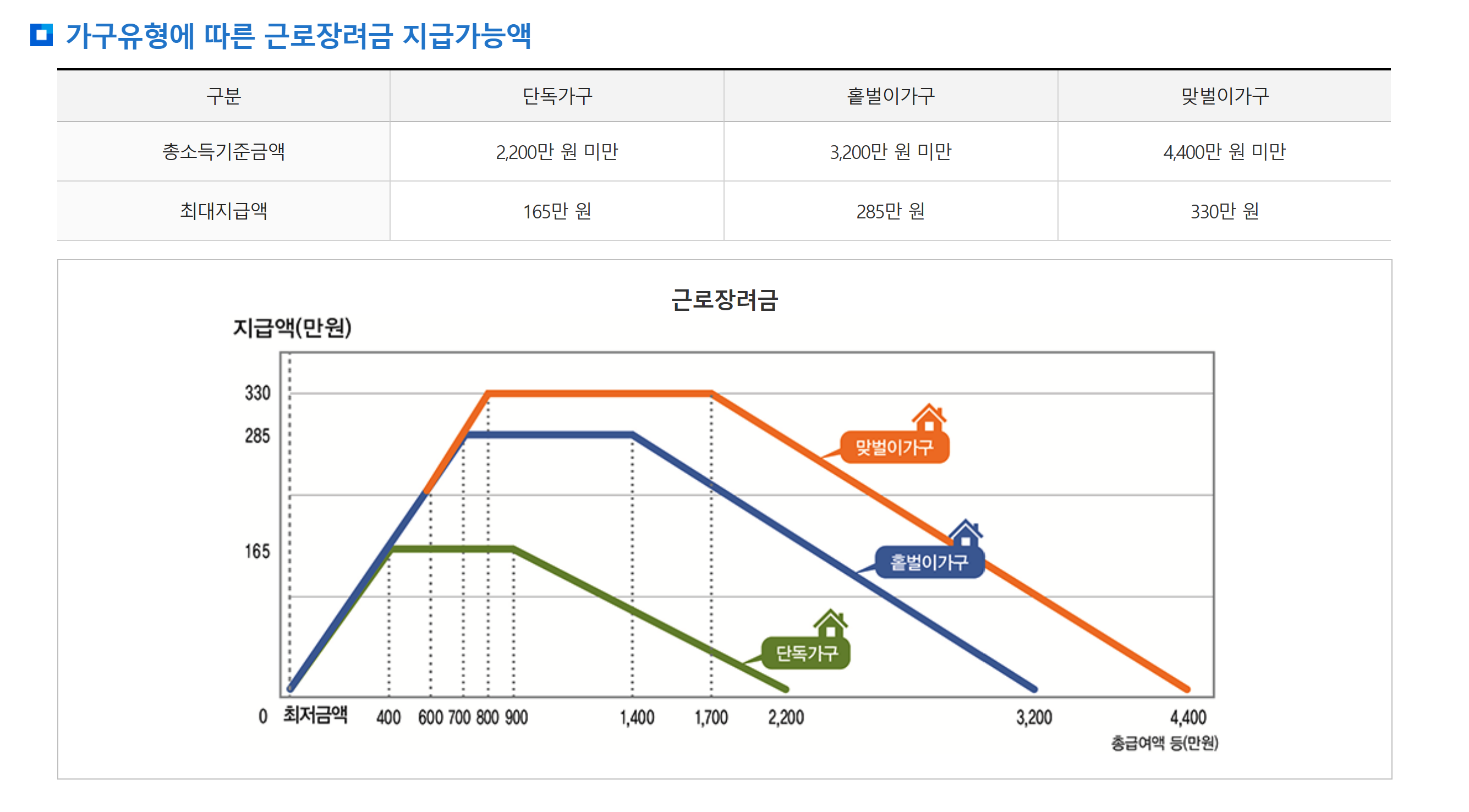 가구 형태에 따라 근로장려금 신청자격의 소득 기준은 달라집니다.