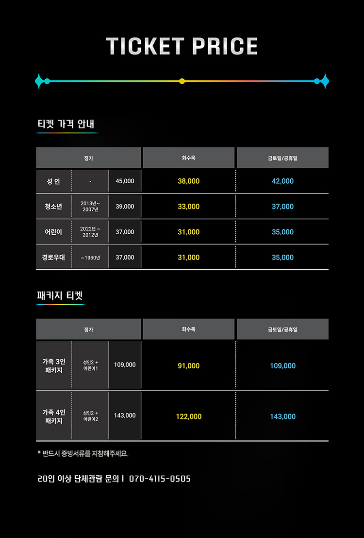 주의사항: 할인 대상자(청소년, 경로우대 등)는 생년 확인 가능한 증빙서류 필수 지참. 미지참 시 정가 차액을 현장에서 납부해야 합니다.