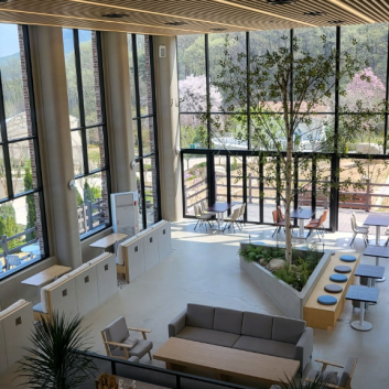자작나무숲 내 위치한 3층짜리 감성 카페입니다. 층마다 서로 다른 뷰를 제공하며, 내부 인테리어 또한 자연과 어우러진 따뜻한 분위기로 꾸며져 있습니다.