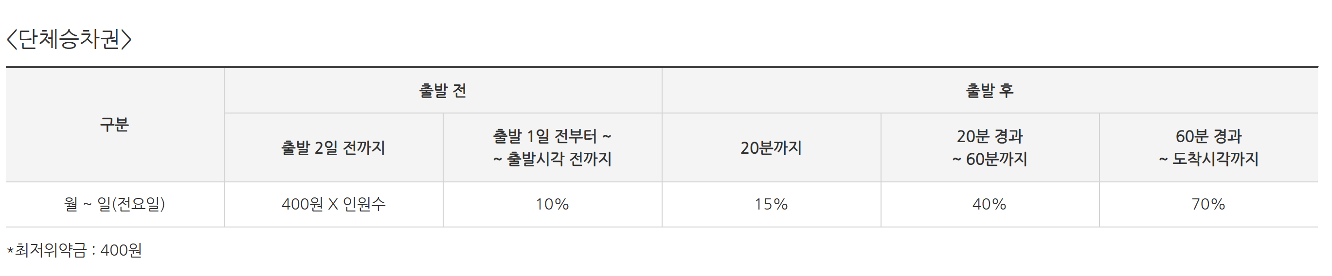 - 구입한 승차권을 환불하는 경우 환불시점에 따른 위약금이 발생합니다.